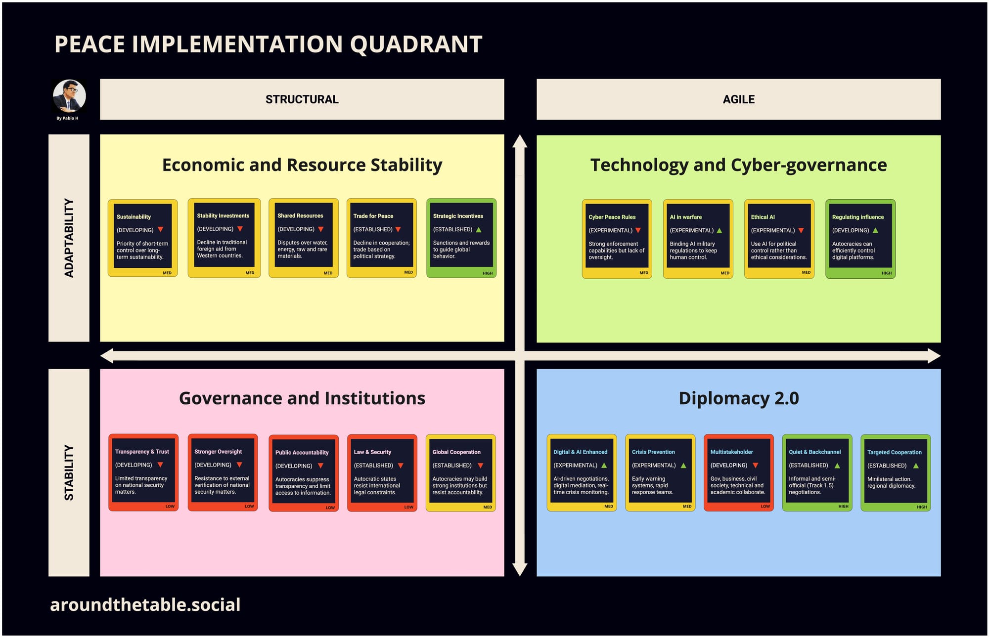 In this post, I introduce a framework called the Peace Implementation Quadrant, designed to sustain peace in a world of shifting power dynamics. By integrating governance, new diplomatic practices, economic stability, and technology policy, this model balances long-term stability with the flexibility needed to navigate evolving threats and opportunities. It offers a proactive approach to countering institutional decline by combining enduring strengths with emerging innovations, such as data-driven diplomacy and cyber governance.