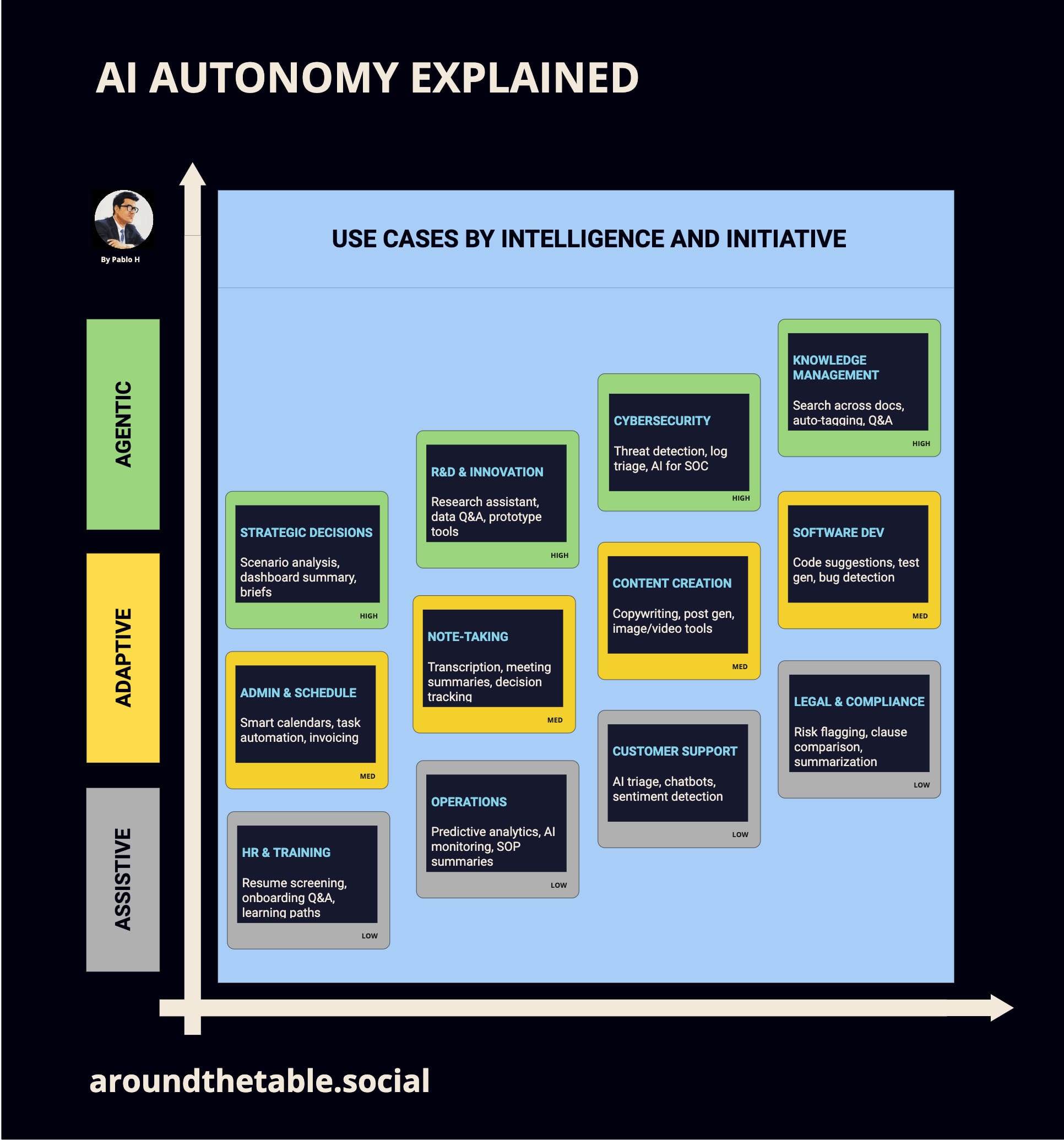 The following chart helps organizations evaluate how AI can support different functions by mapping use cases across a spectrum of autonomy. Each category—assistive, adaptive, and agentic—represents a distinct level of initiative and integration, from basic task support to systems capable of pursuing goals independently. For any AI strategy to be effective, it’s essential to clarify not only where AI can add value, but also to what extent: should the system assist, respond to context, or take initiative?